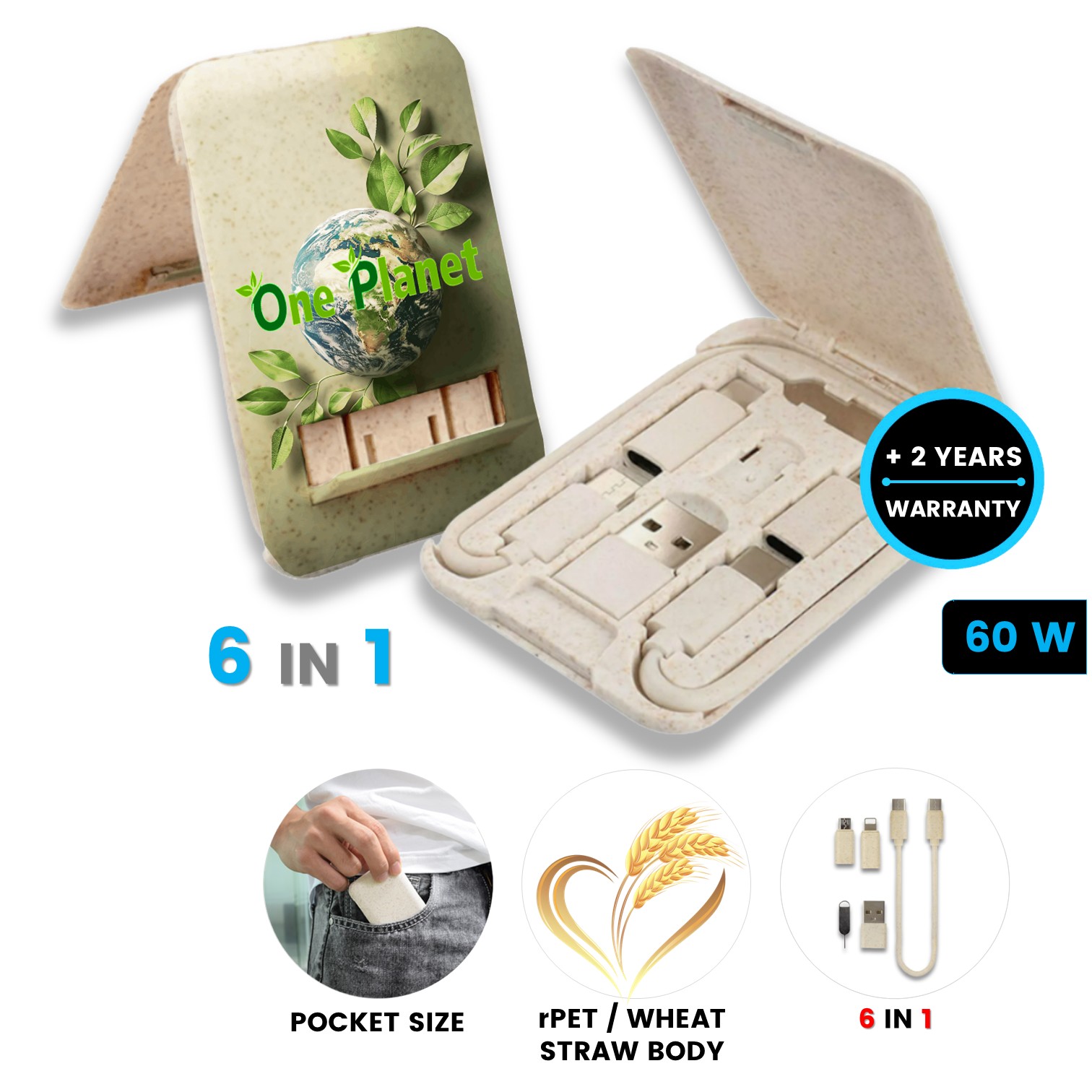 Multi-functional cable in a practical box with phone stand, made of wheat straw