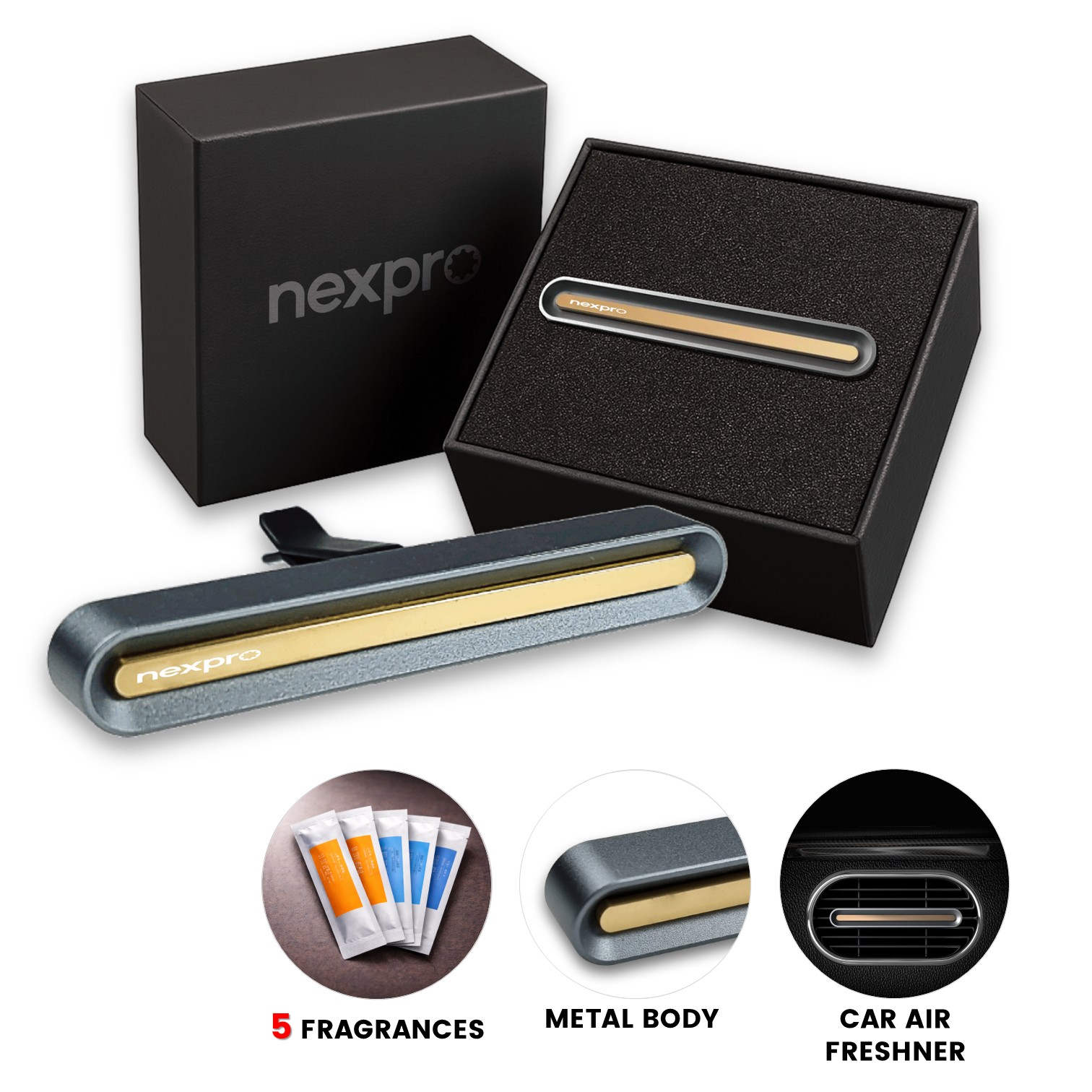 Elegant metal car air freshener, set of 5 fragrances
