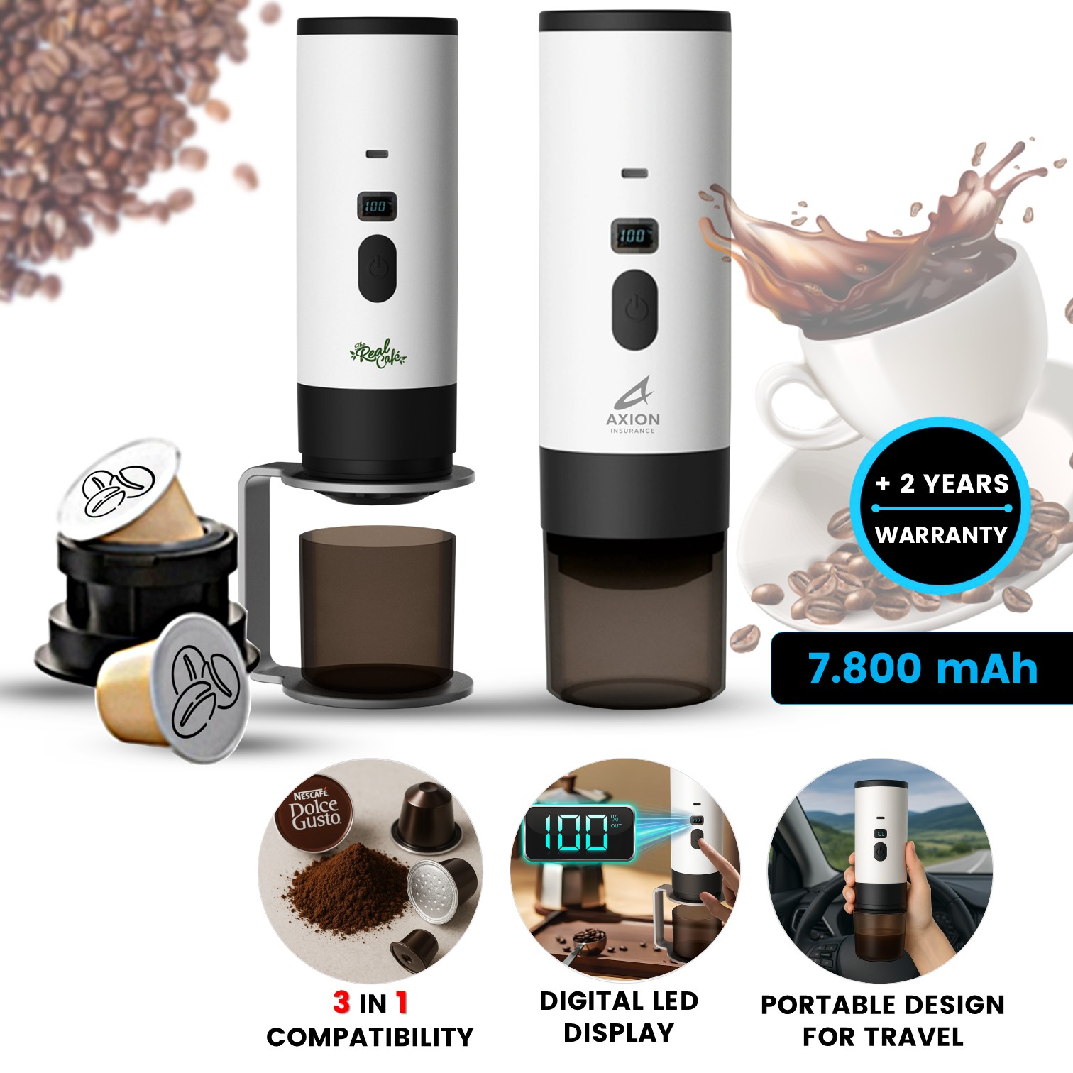 Portable mini coffee maker HEATBREW for capsules or ground coffee