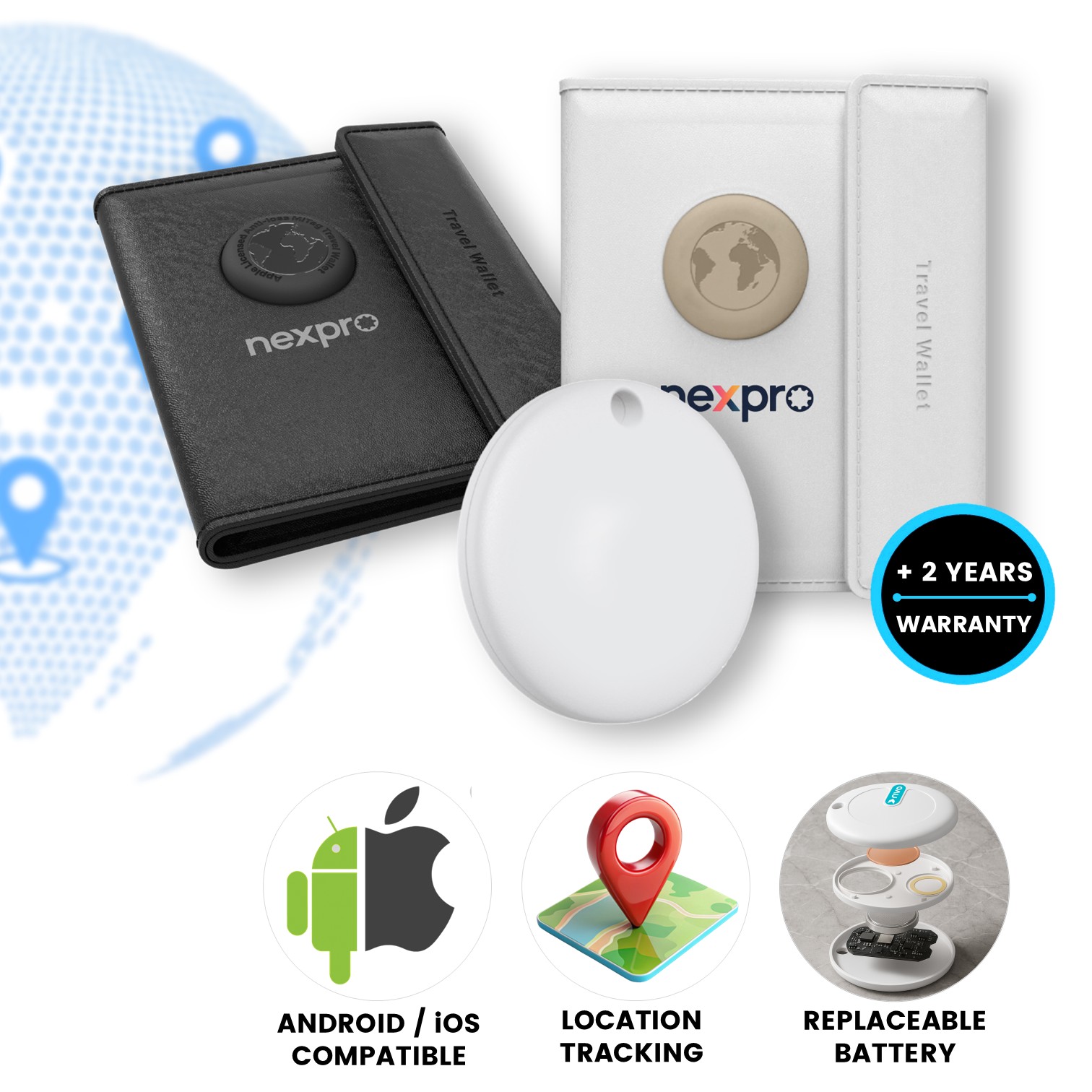 Travel wallet with integrated TagMate smart tracking tag, compatible with iOS and Android